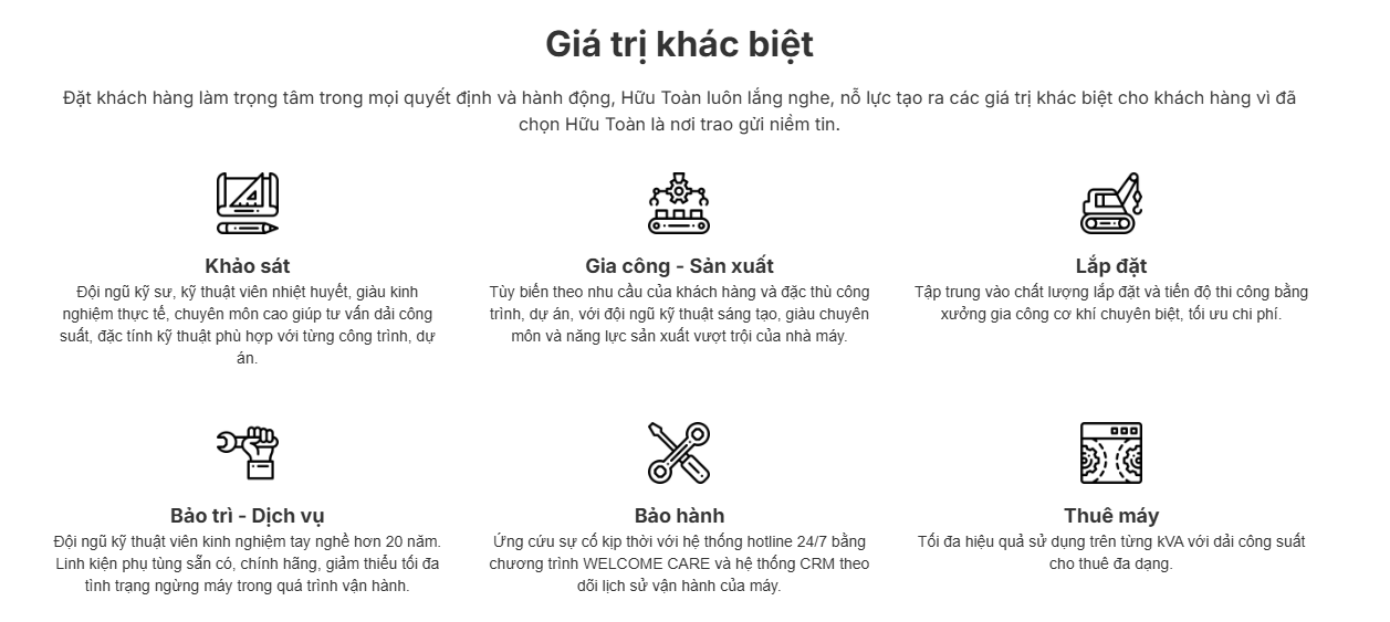 Hữu Toàn được thành lập năm 1982, với gần 50 năm kinh nghiệm trong việc sản xuất máy phát điện, Hữu Toàn nắm bắt các xu thế và tập trung nguồn lực nghiên cứu các giải pháp chuyên sâu nhằm đáp ứng kịp thời các nhu cầu năng lượng phù hợp với thực tiễn địa phương và tối ưu vận hành cho khách hàng.